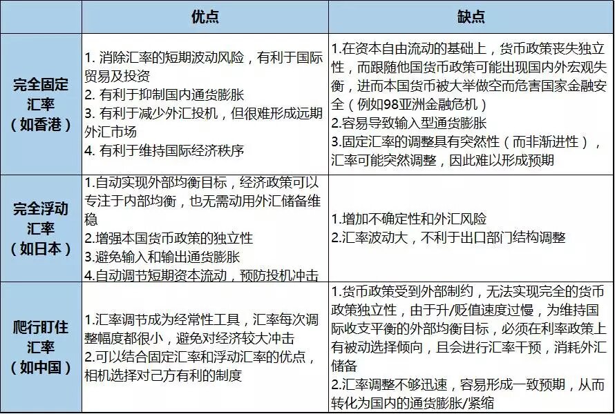 以上是汇率约束货币政策的理论基础。基于不可能三角的存在,一国总会面临汇率制度的选择。事实上,选取哪种汇率制度和一国的经济规模、通胀率、贸易伙伴集中程度、国际经济压力、经济发展水平、宏观经济政策的选择和配合密切相关。现实中,极端的汇率制度有完全固定和和完全浮动两种,前者一般是经济不发达国家(如古巴、朝鲜、黎巴嫩、尼泊尔等)或转口贸易型经济体(如香港),后者则一般是发达国家(如日本、美国、加拿大等)。而相当一部分国家(包括我国)采取的是爬行盯住制度,汇率每天变动的幅度被限制,采取“小步慢跑”的方式缓慢变动。我们总结了各制度的优劣势如下表: