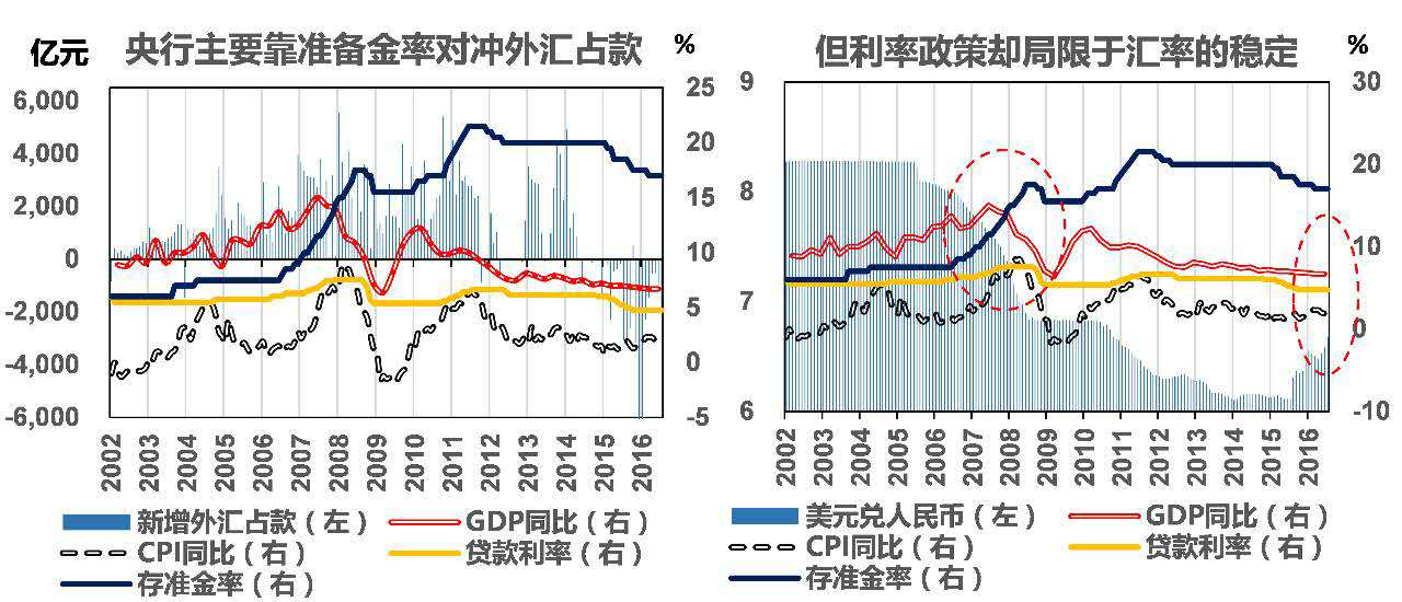 在这样的动态平衡的框架下,央行的货币政策将时有被汇率“维稳”需要所牵制。因为货币出现升值压力时,担心升值会损害出口竞争力或破坏出口多元化的格局;出现贬值压力时,贬值又可能引起债务负担加重、经济衰退,还可能造成输入型通货膨胀,更要命的是贬值预期将会加大贬值压力,形成负反馈循环。在此背景下其它货币政策会从某种程度上被约束。接下来以我国为例,来说明这样的“牵制”源自何处。