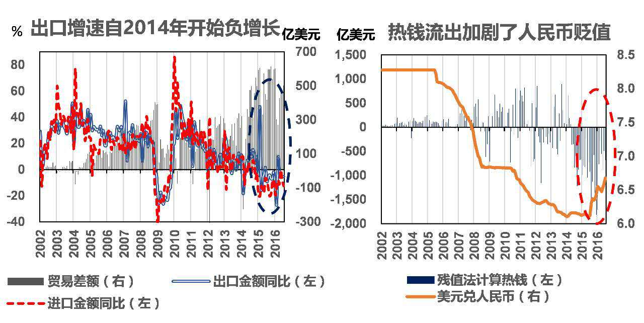 接下来,2014年是个重要的分水岭,此后中国的经济增速放缓(见上图中GDP同比),对外贸易走向疲软,出口增速大幅下降(见左下图)。在对国内经济形势的中性及悲观预期中,前十年由于汇率单向波动带来的裹挟在贸易中的投机盘开始退出,境内“热钱”也终止了多年流入的趋势,开始大幅流出(见右下图),人民币开始出现明显的贬值预期。在此背景下,央行于2015年8月启动了第三轮汇改,将人民币汇率决定机制的市场化程度大大加深,但由此人民币的贬值压力也得到释放,人民币兑美元汇率开始迅速走低(见右下图)。这时,央行又为尽量稳定人民币汇率,消除人民币过快贬值预期而努力(过快贬值的预期会对经济形成严重后果),为此央行在外汇市场大笔购汇,使得外汇储备被大量消耗,外汇占款大幅下降(见上表中央行外汇资产,以及左上图中外汇占款趋势),同时货币政策在刺激国内经济方面也始终没有发挥全力,利率不能下降太快,甚至存款准备金率也不可能下降太多。这是货币政策被汇率“牵制”的第三处例子。