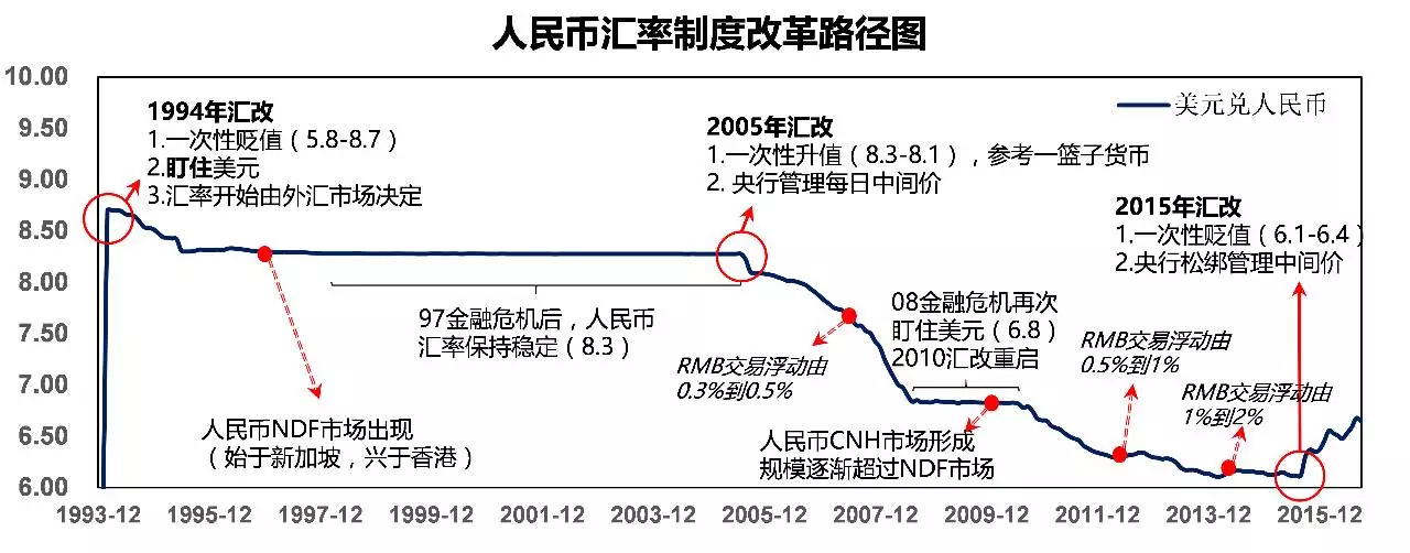 建国后至1994年前,我国的汇率是由行政指令决定而非由市场决定,本文不拟详述(感兴趣的读者可以去查阅历书籍)。在这样的封闭及非市场化体制下,我国汇率存在严重的结构性高估失衡(1985年我国的官方汇率为1美元兑换2.8人民币,1993年屡次调整后为1美元兑换5.8人民币)。因此在改革开放不断深化的背景下,我国市场化的汇率制度在1994年被初步建立。之后,人民币的汇率体系历经了三次重大变化,分别于1994年汇改、2005年汇改和2015年汇改。我们将人民币汇率制度改革路径做成图,如下表所示,接下来我们详细阐述人民币汇率体系改革的“前世今生”。