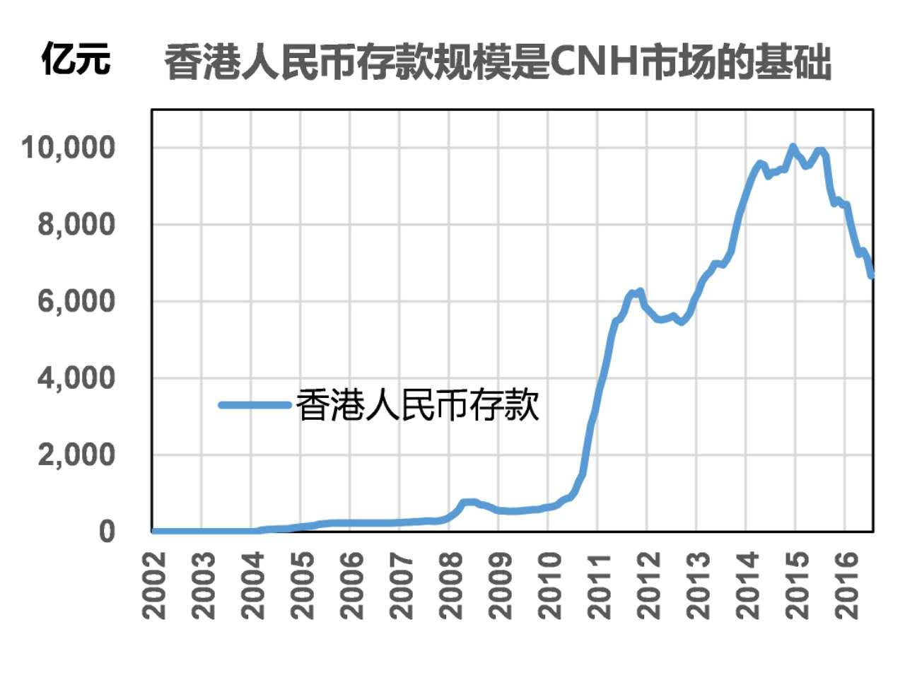 在人民币汇率再次停止浮动静如止水的时光里,在人民币国际化的大背景下,香港建立了人民币清算、现货交易体系,并于2010年7月形成了真正意义上的离岸人民币即期汇率市场(CNH市场[3])。境内银行在香港扮演人民币“央行”角色,为离岸人民币市场投放基础货币,从而派生出整个离岸人民币存款体系。
