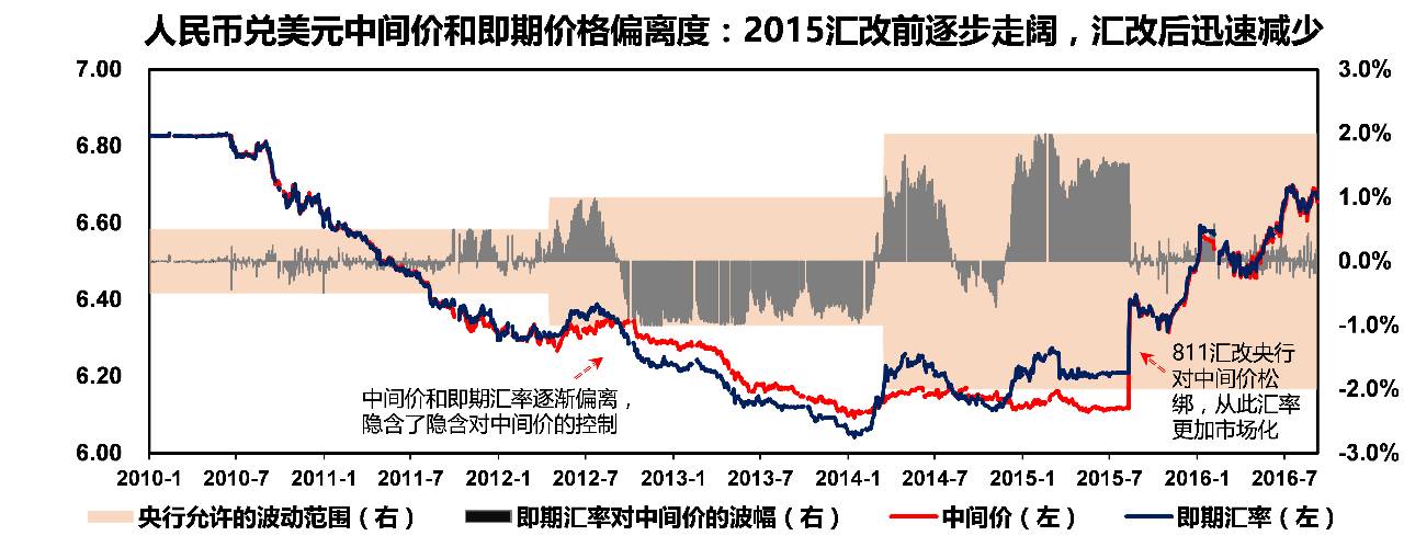 虽然在2010年汇改重启后,央行不断放松即期汇率对中间价的波动幅度限制,2012年4月由0.5%提高到1%,2014年3月又进一步提高到2%。但中间价本身由央行掌握,久而久之出现了中间价和即期汇率较大的偏离。2012至2014年频现“开盘涨停”,2014年以来资本流向趋势反转,则出现了“开盘跌停”,中间价却几乎不改变(2015年下半年)的奇特景观。这背后明显的央行操作不利于人民币国际化的诸多谈判(如加入SDR),也不利于建立市场化的市场化汇率制度。因此,2015年8月11日,中国央行发布了《中国人民银行关于完善人民币兑美元汇率中间价报价的声明》,调整了人民币汇率中间价形成机制,使其市场化程度大大加深。另外,2015年8月11日当日人民币兑美元一次性贬值2%至至1美元兑6.23元人民币。